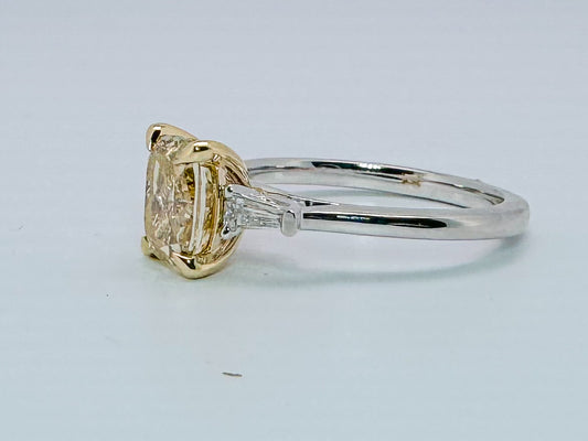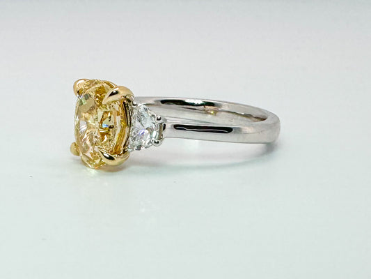 14k two tone 1.52 VS2 Fancy yellow lab grown oval set with .19 baguettes.