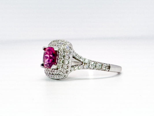 14k, white gold 1.17 rhodolite garnet set with .56 carats of natural side diamonds.