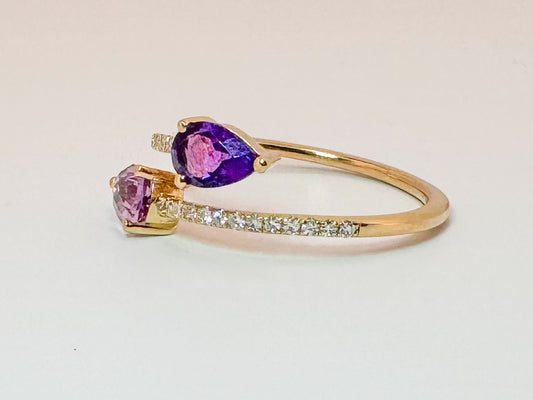 14k, yellow gold, .60 carat total weight Amethyst with .15 diamond total weight side diamond, open concept fashion ring.