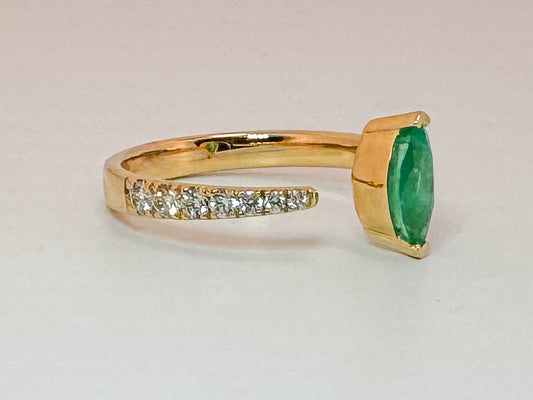 14K yellow gold, Natural emerald and diamond open concept modern fashion ring.
