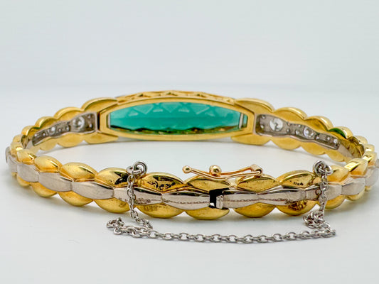 18k two tone, custom cut 26.4 carat blue green Tourmaline with 1.44 carat total weight in side diamonds.