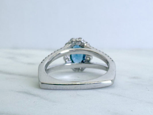 6.33 carat blue green tourmaline with .63 tw side diamond. Set in 14k white gold