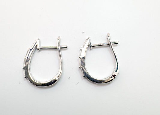14k, white gold, round brilliant and baguette diamond hoop earrings.