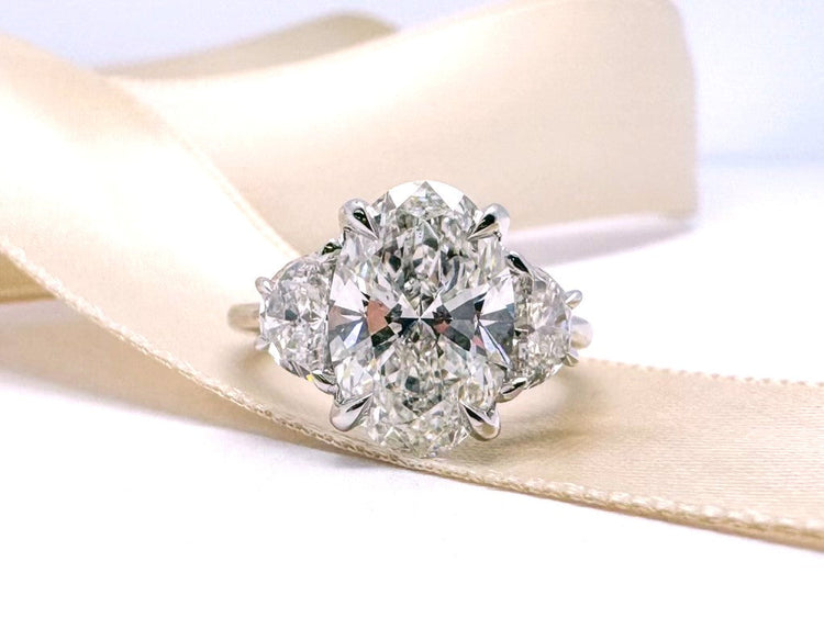 14k, White gold solitaire, set with 4.02 carat lab grown oval diamond. GIA Certified. VS1 E