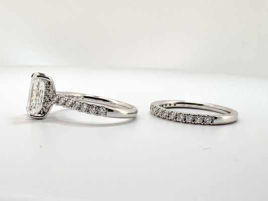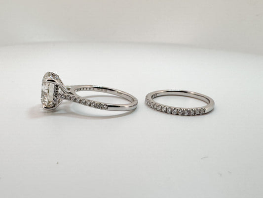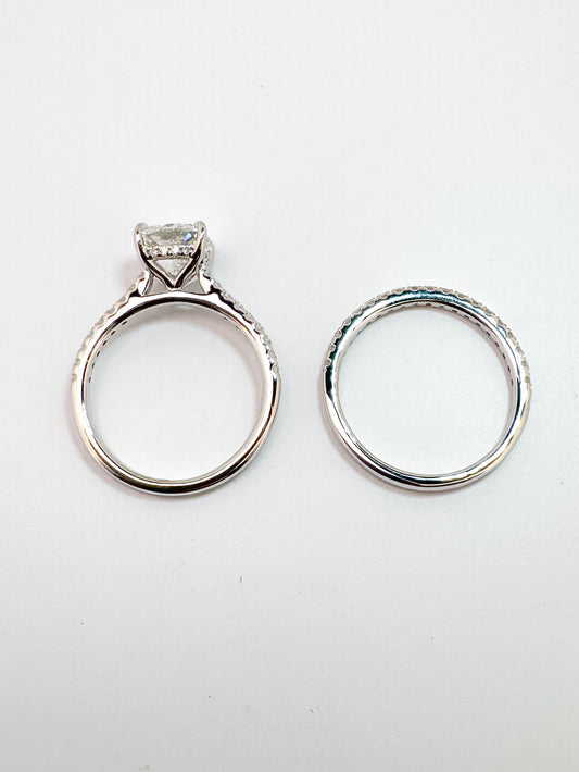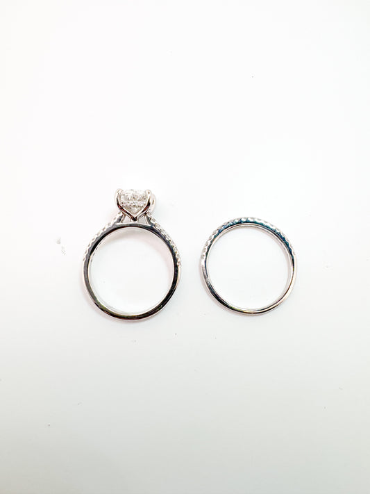 14K, white gold 2.03 lab grown cushion cut set with .50 side diamond. Wedding set.