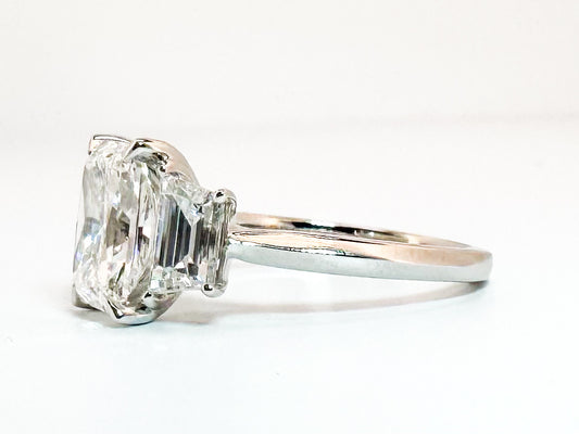 14K white gold 2.51 center radiant cut lab diamond set with 1.29 carat lab grown step shield side diamonds.