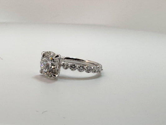 14K, white gold, 2.08 lab grown VS2 G Round brilliant set with .42 carats of side diamonds. IGI certified