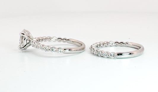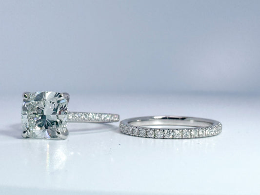14K, white gold, 3.01 F VS1 Cushion cut set with .53 carats of side diamonds. Wedding set IGI Certified Lab grown