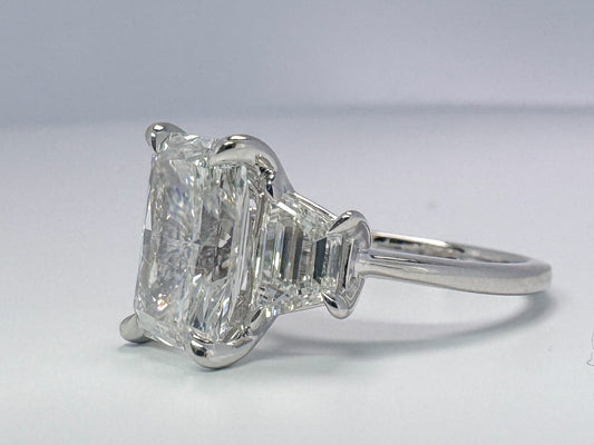 Lab grown radient cut diamond engagement ring with trapezoid sides.