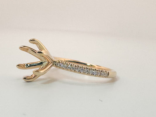 14K, yellow gold .13 side diamond total weight, Semi mount to hold 8mm stone.