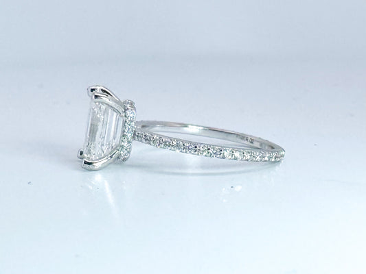 2.05 Natural VS1 E Emerald cut diamond set in classic diamond hidden halo engagemet ring. GIA certified