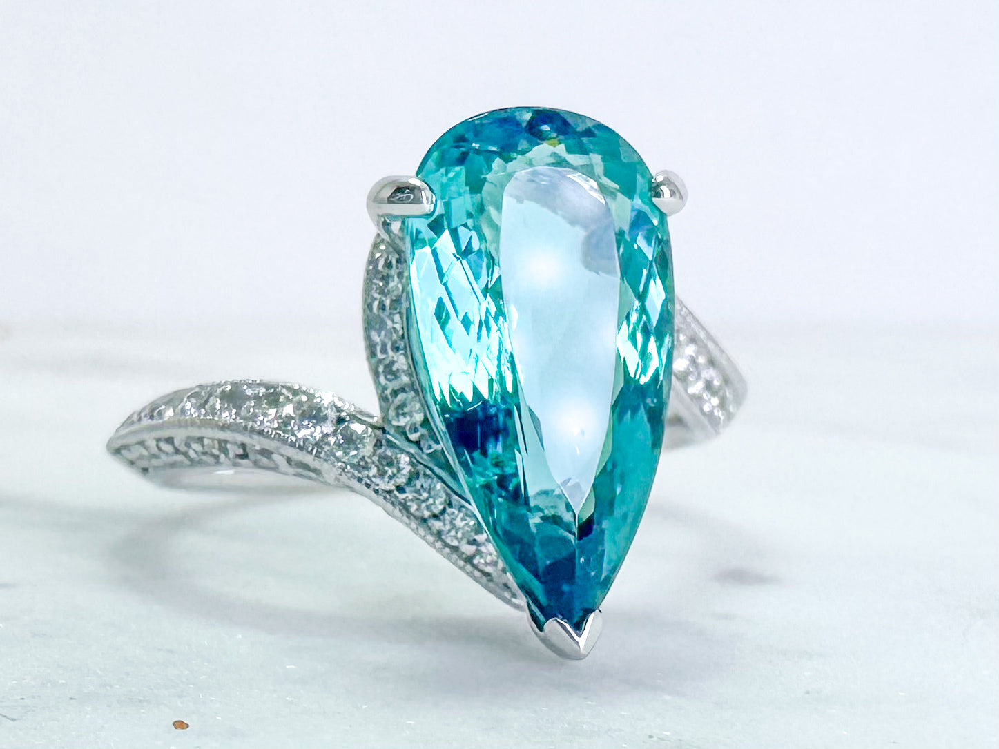 14k, white gold, custom design! 3.89 carat blue green, pear shaped tourmaline fashion ring. This center stone is EVERYTHING! It has that blue green hue that is just spectacular. The mounting is a custom design bypass that has 1.31 carat of pave set diamonds. This is the crystal of Spirt and peace, and now a days we can all use a lot of that.
