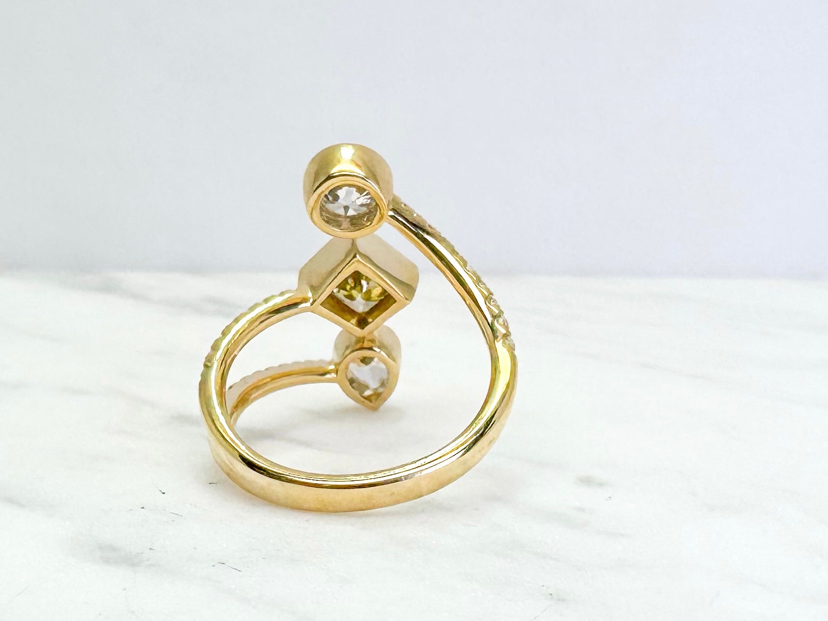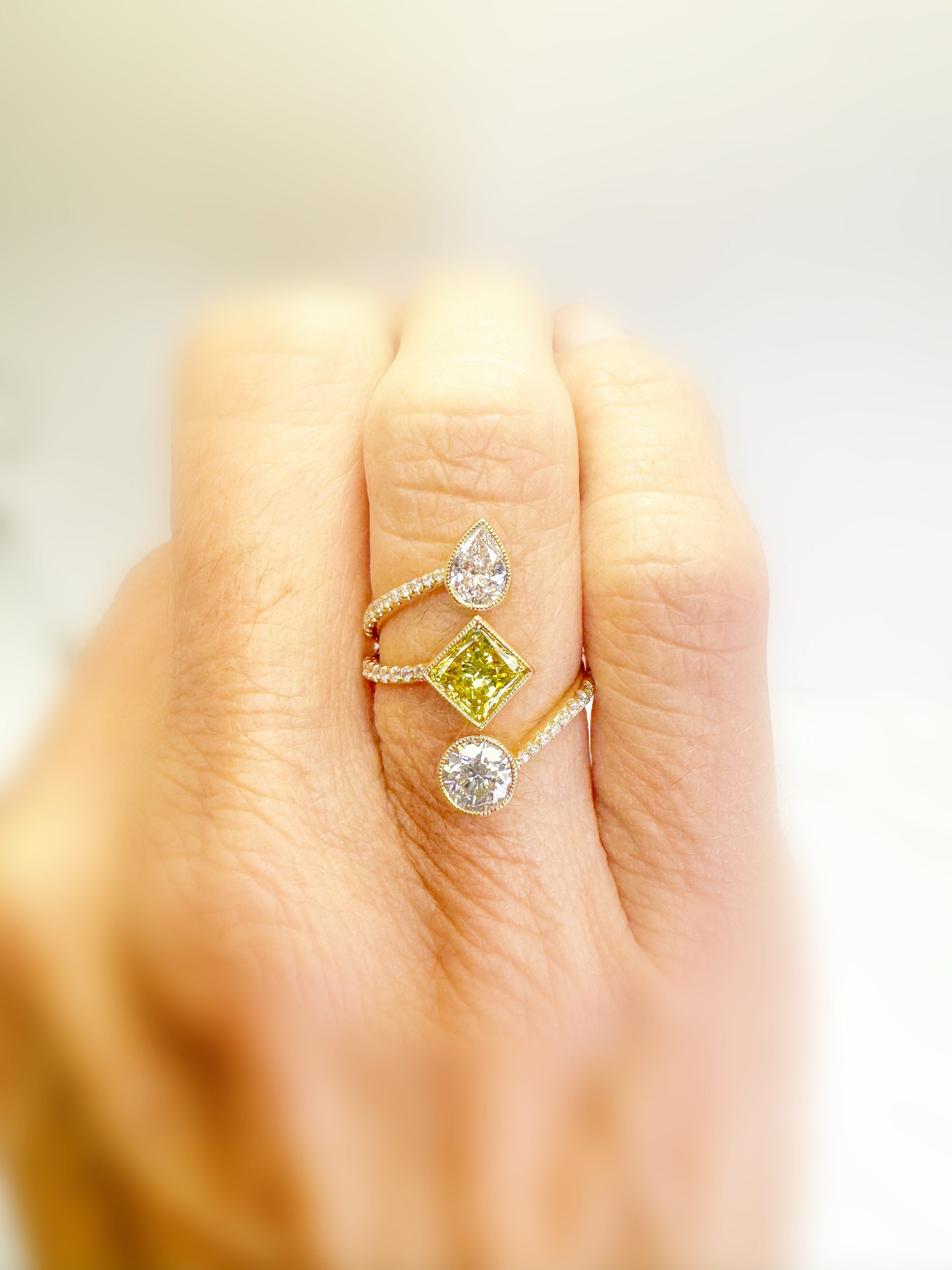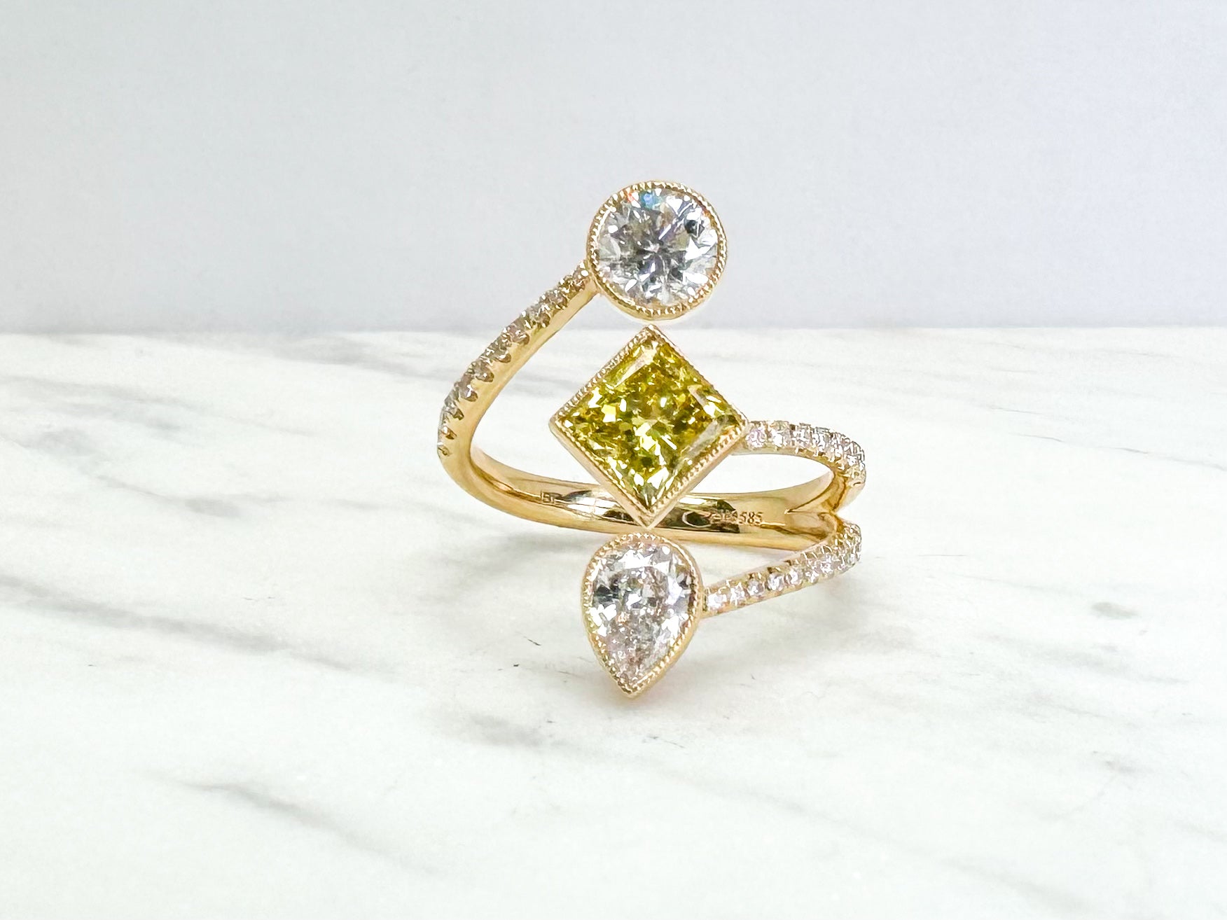 14k, yellow gold, custom diamond ring. This ring screams " I'M a Diamond Girl"Like no other. This ring contains one .60 round brilliant, I1, I one 1.03 carat kite shaped, princess cut, VS2, Irradiated intense fancy yellow, and one .35 Pear shaped diamond, SI1 F, all set in a micro bezel with a hand milgrain finish. .22 carats of french pave side diamonds.