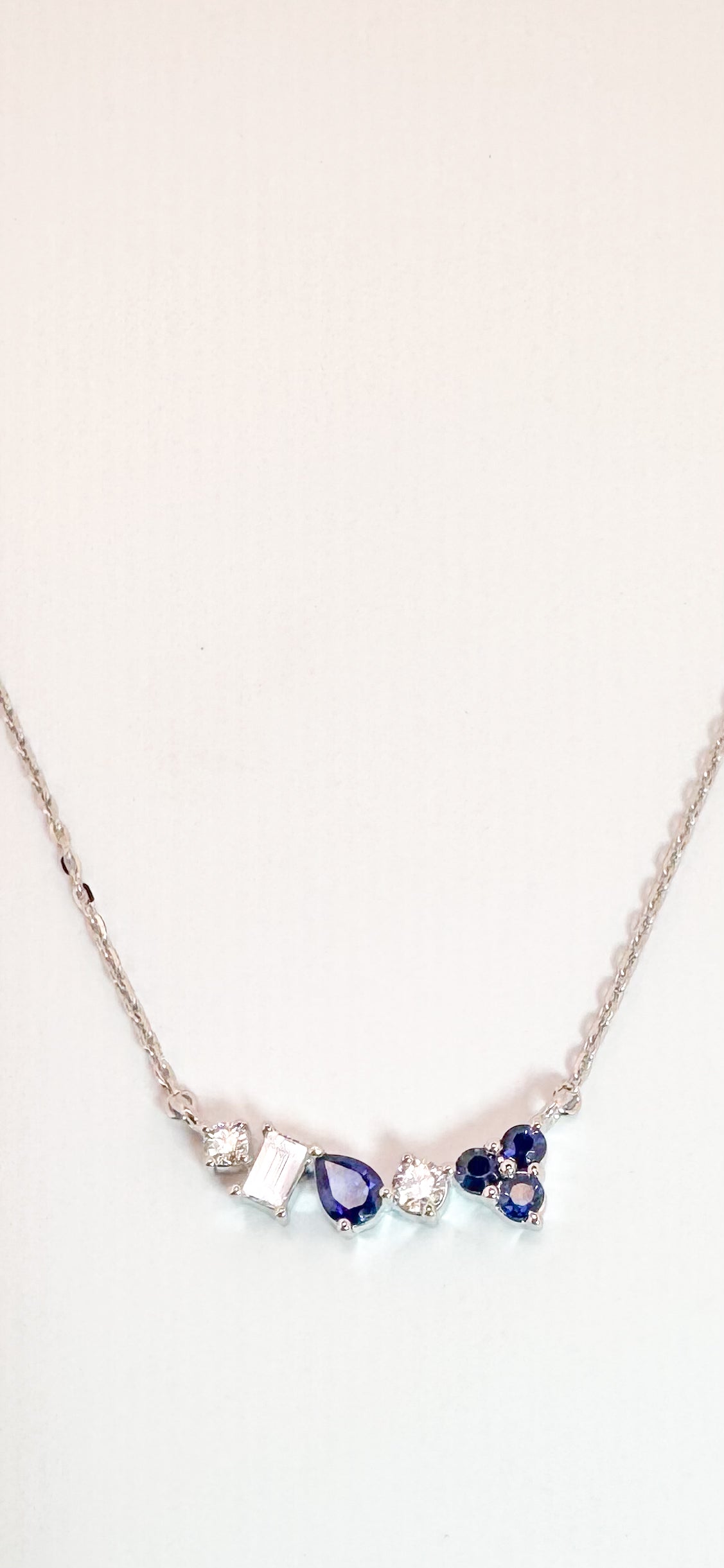 14K, white gold, .18 diamond total weight, .33 carat total weight of natural sapphire. Multi stone necklace