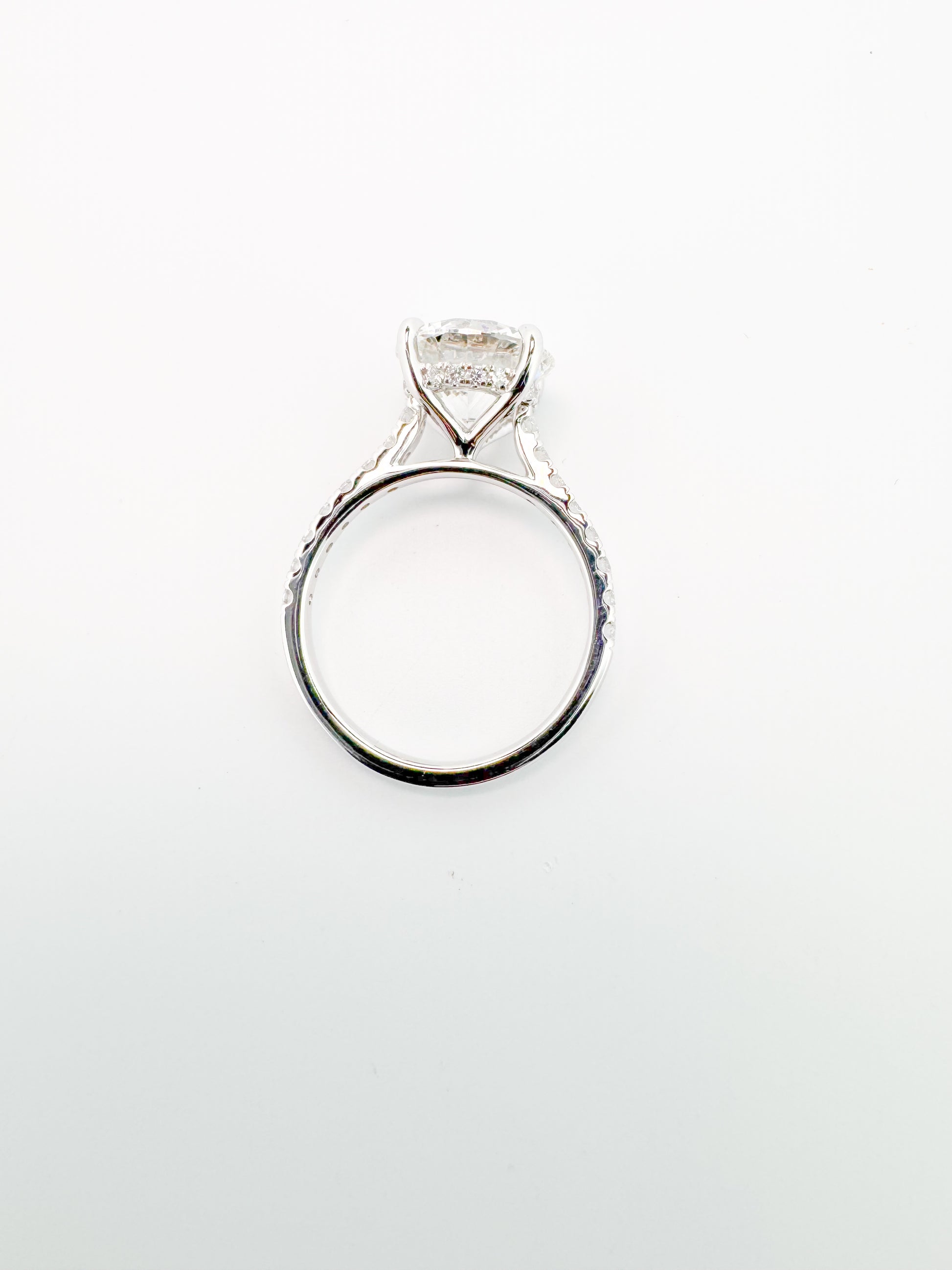 14K, White gold, 4.08 carat VS1 F lab grown center with .47 carats of side diamonds. IGI certified