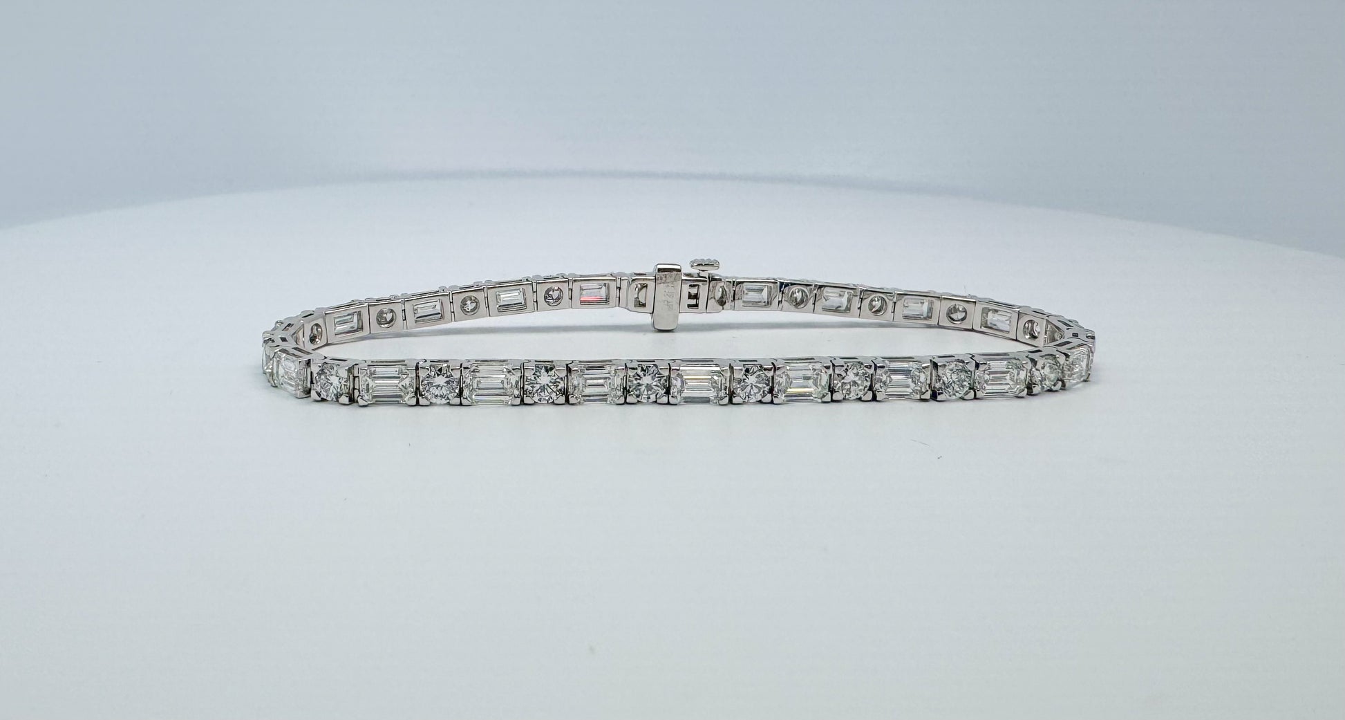 14K white gold Emerald cut & Round brilliant lab grown diamond tennis bracelet. 9.23 carat total weight