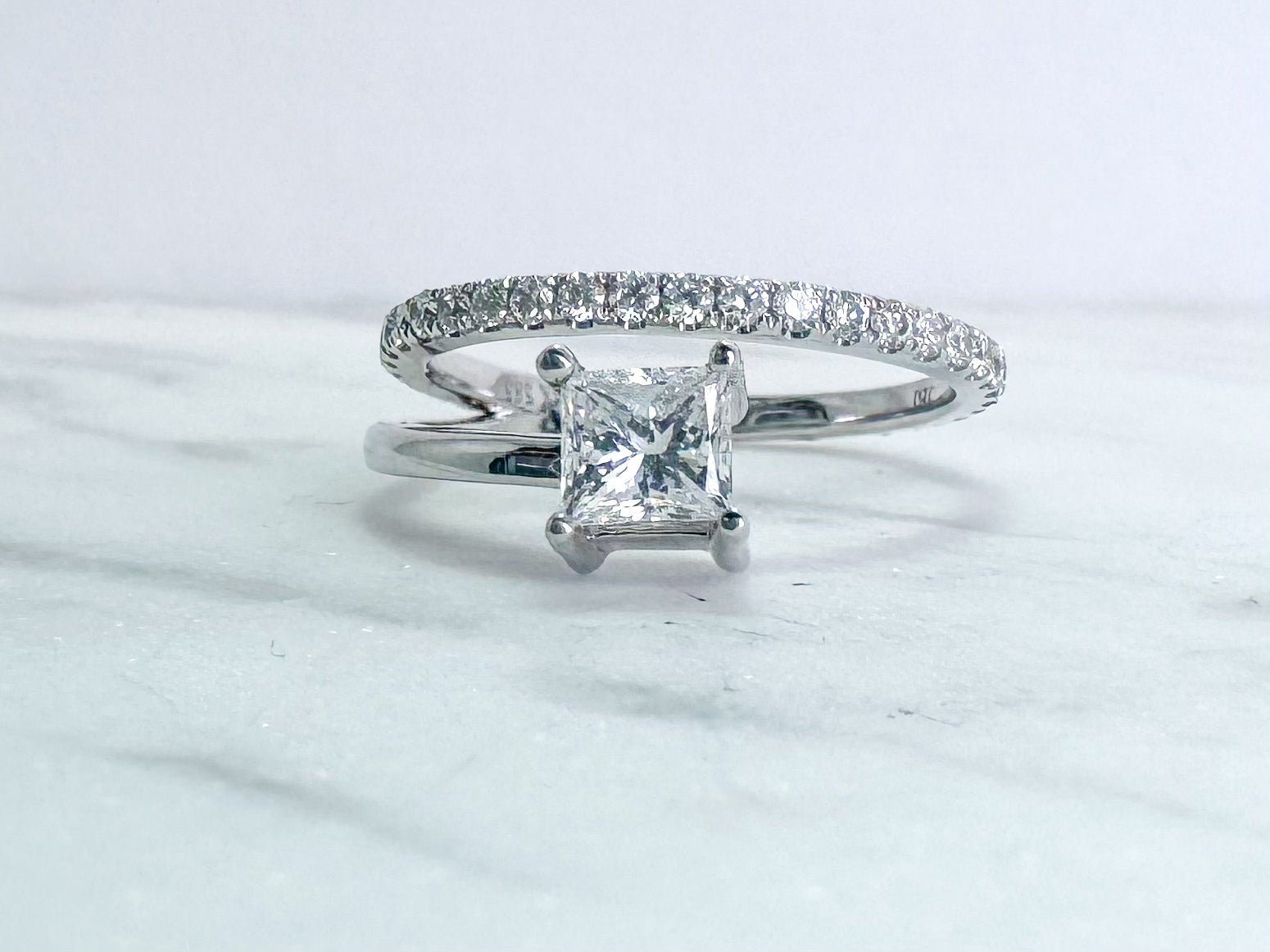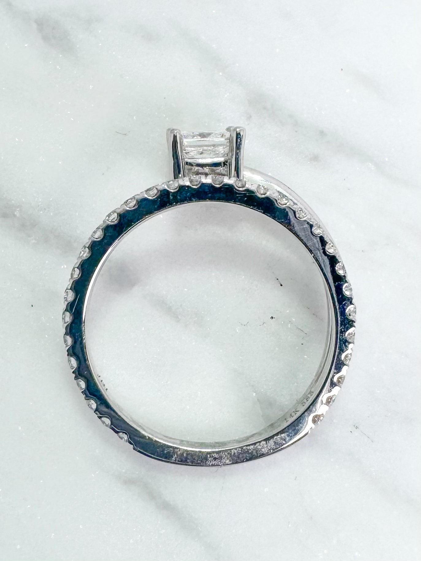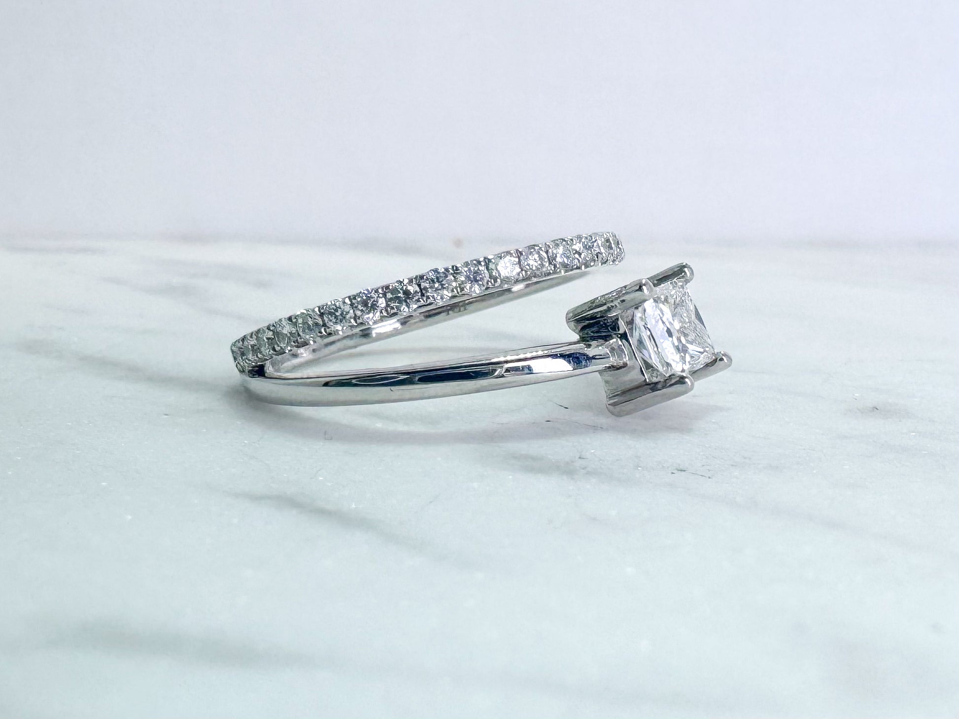 14k, white gold princess cut open concept diamond ring. The ring consists of a .56 carat Princess cut center stone with.48 dtw of swooping round brilliants. Skip the wedding band because this is all in one