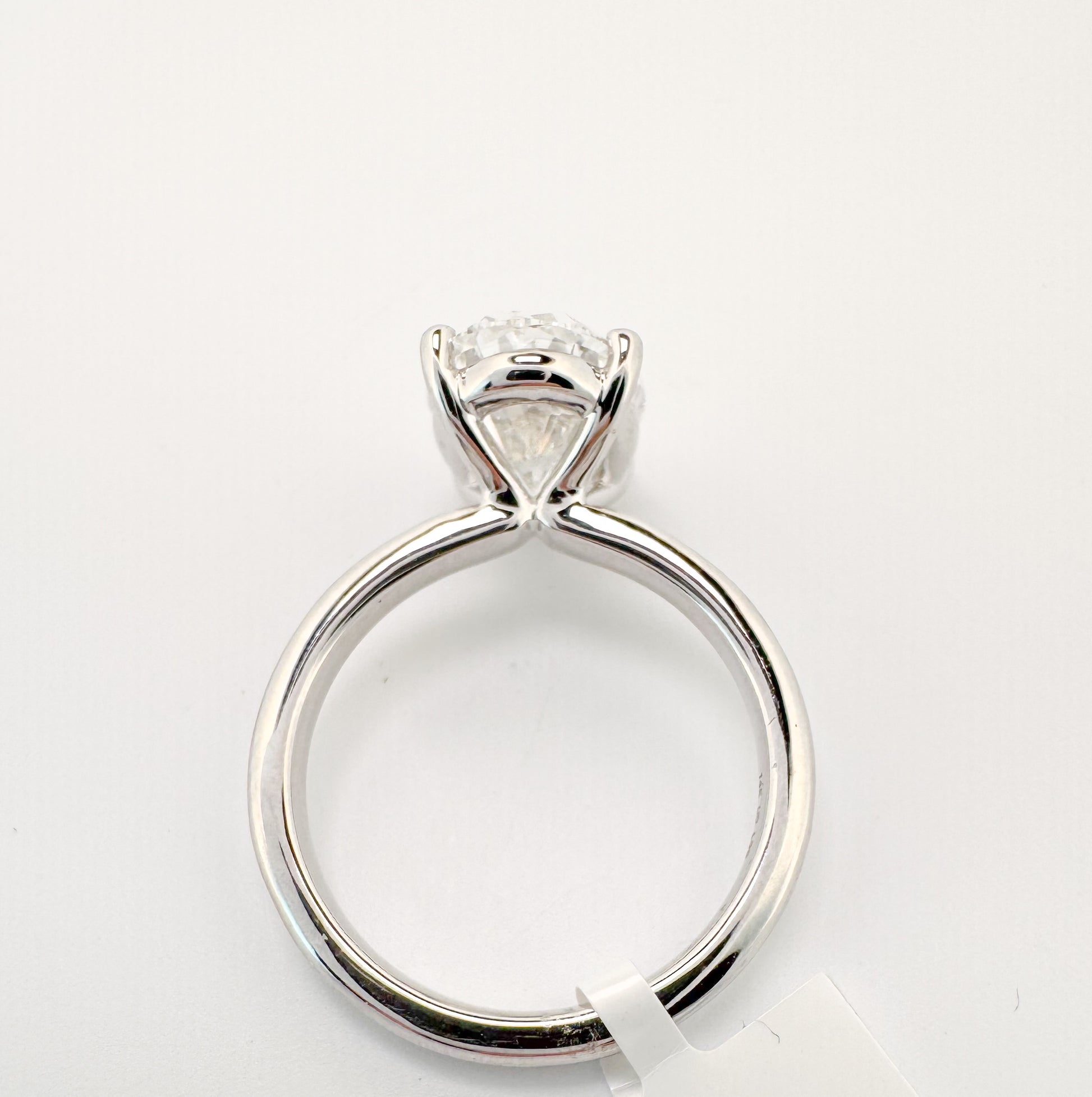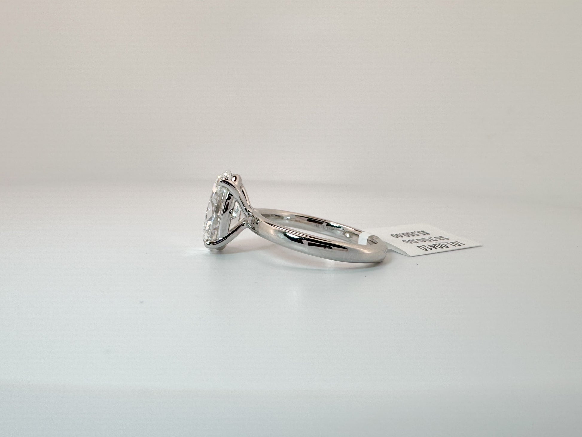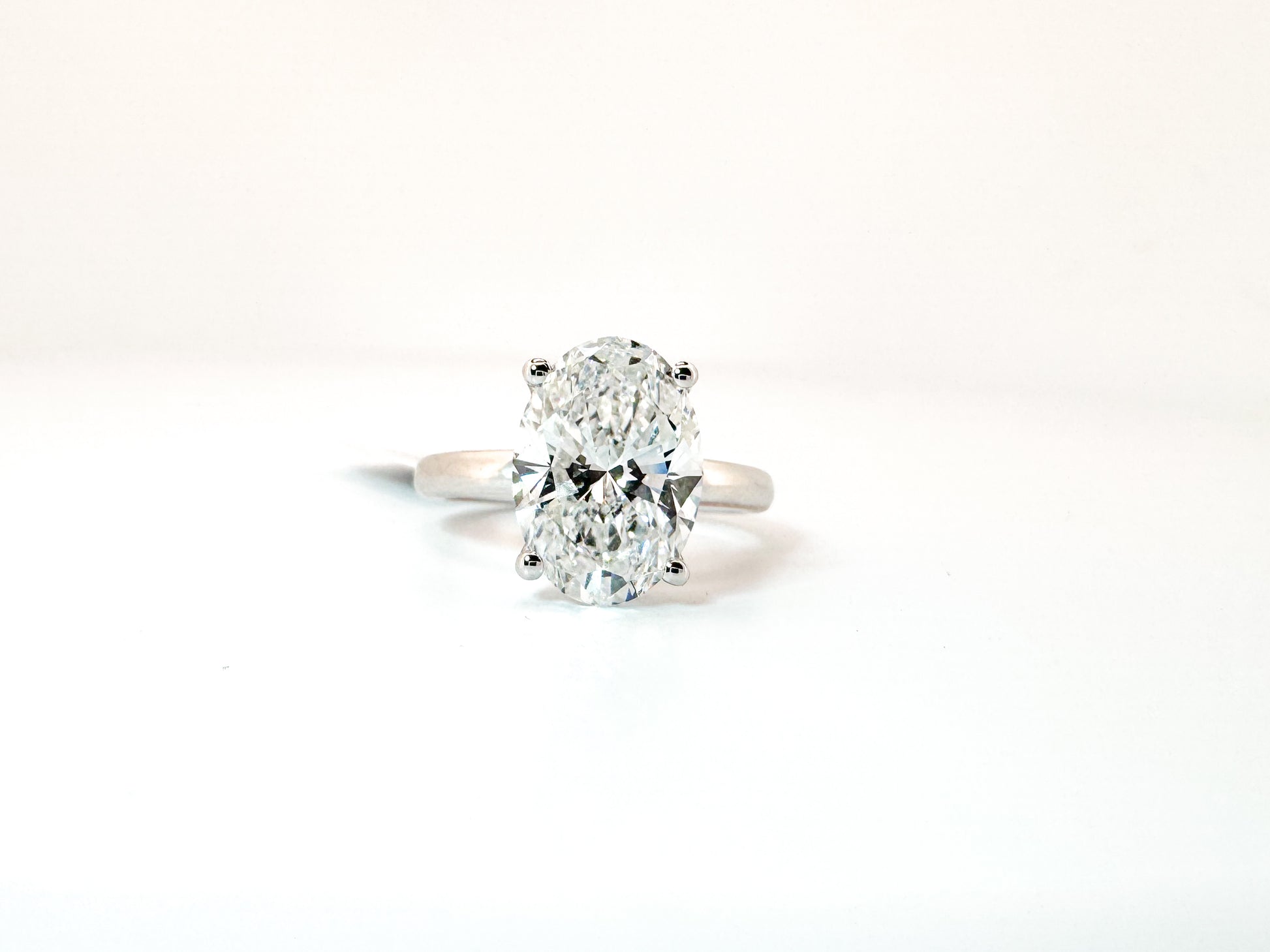 14k, White gold solitaire, set with 4.02 carat lab grown oval diamond. GIA Certified. VS1 E