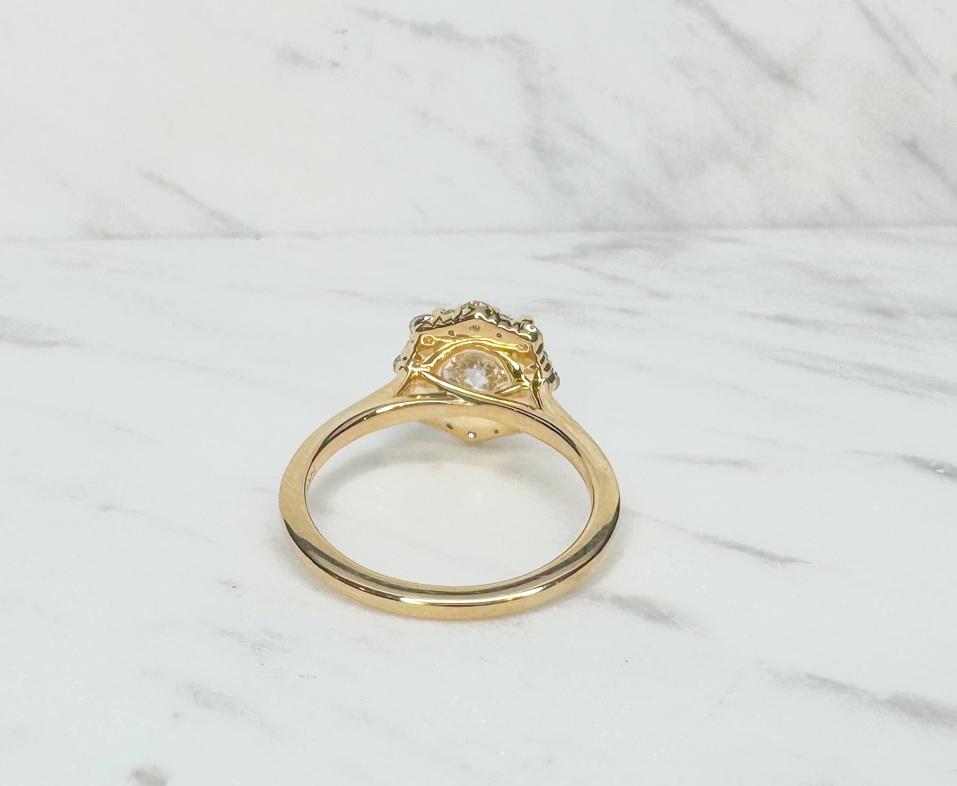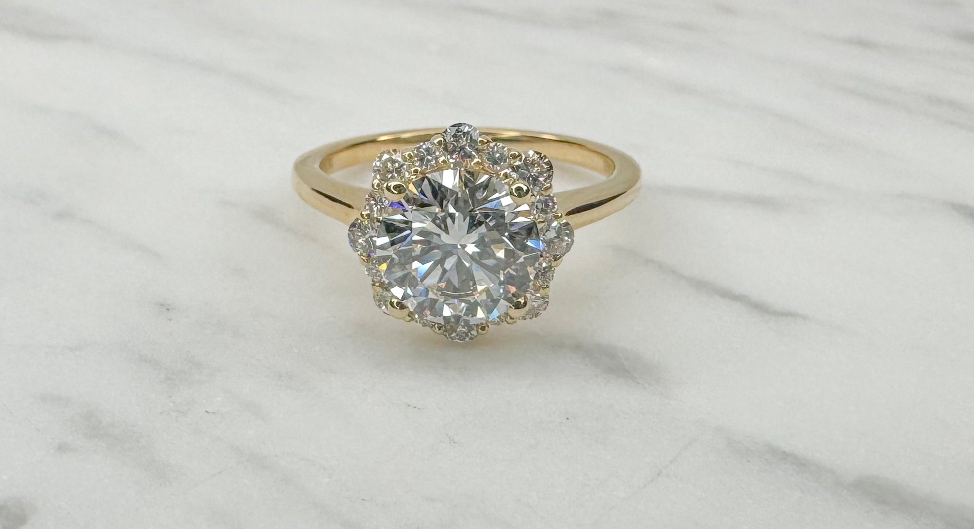 14K, Yellow gold 2.38 carat total weight, scalloped lab grown engagement ring. IGI certified