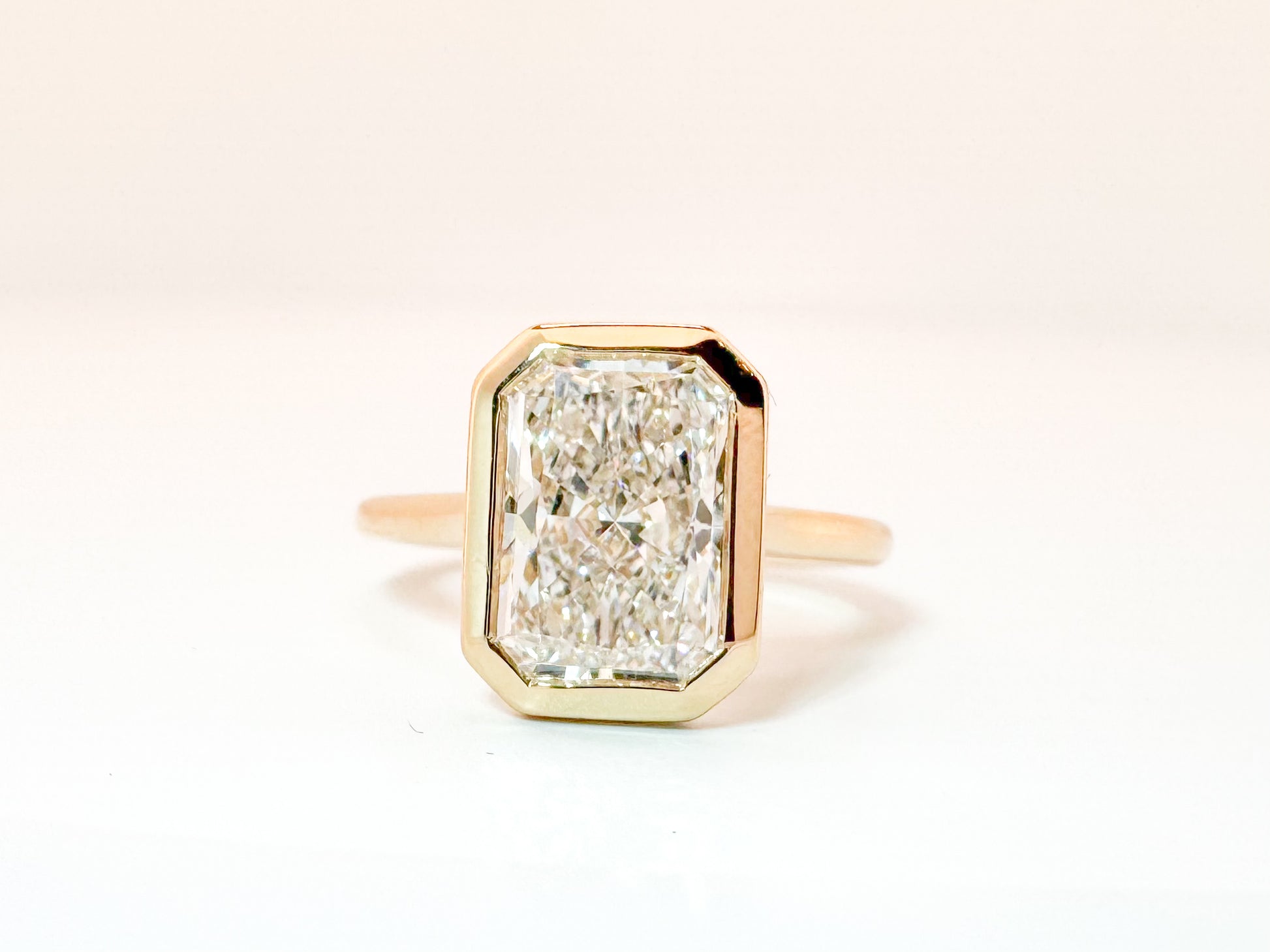 14K, yellow gold, 3.02 carat radiant cut lab grown diamond engagemenbt ring F VVS2 IGI certified