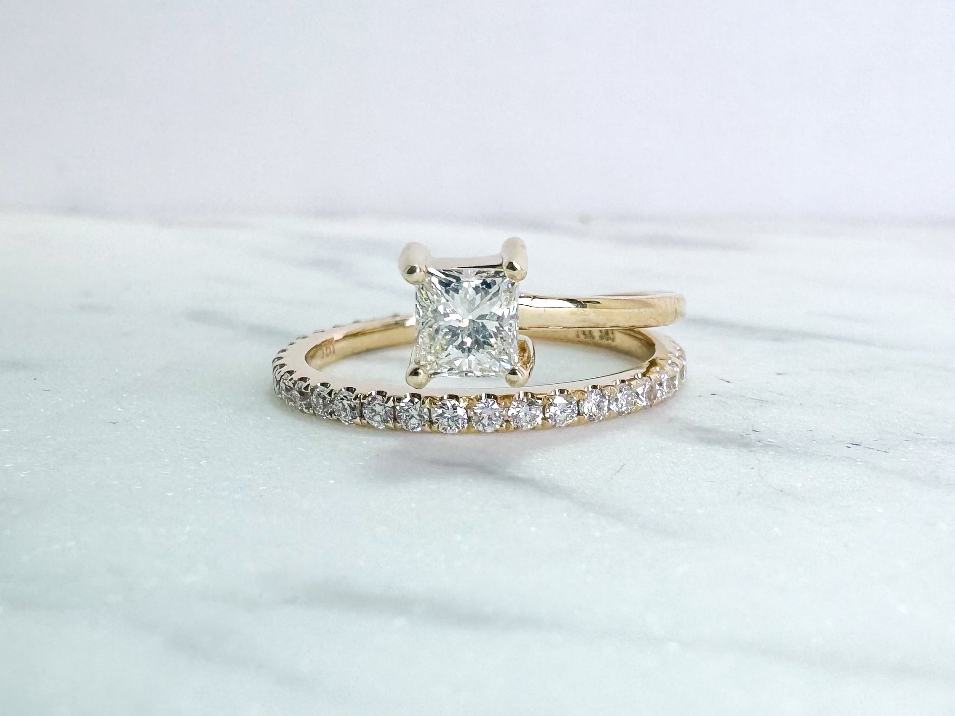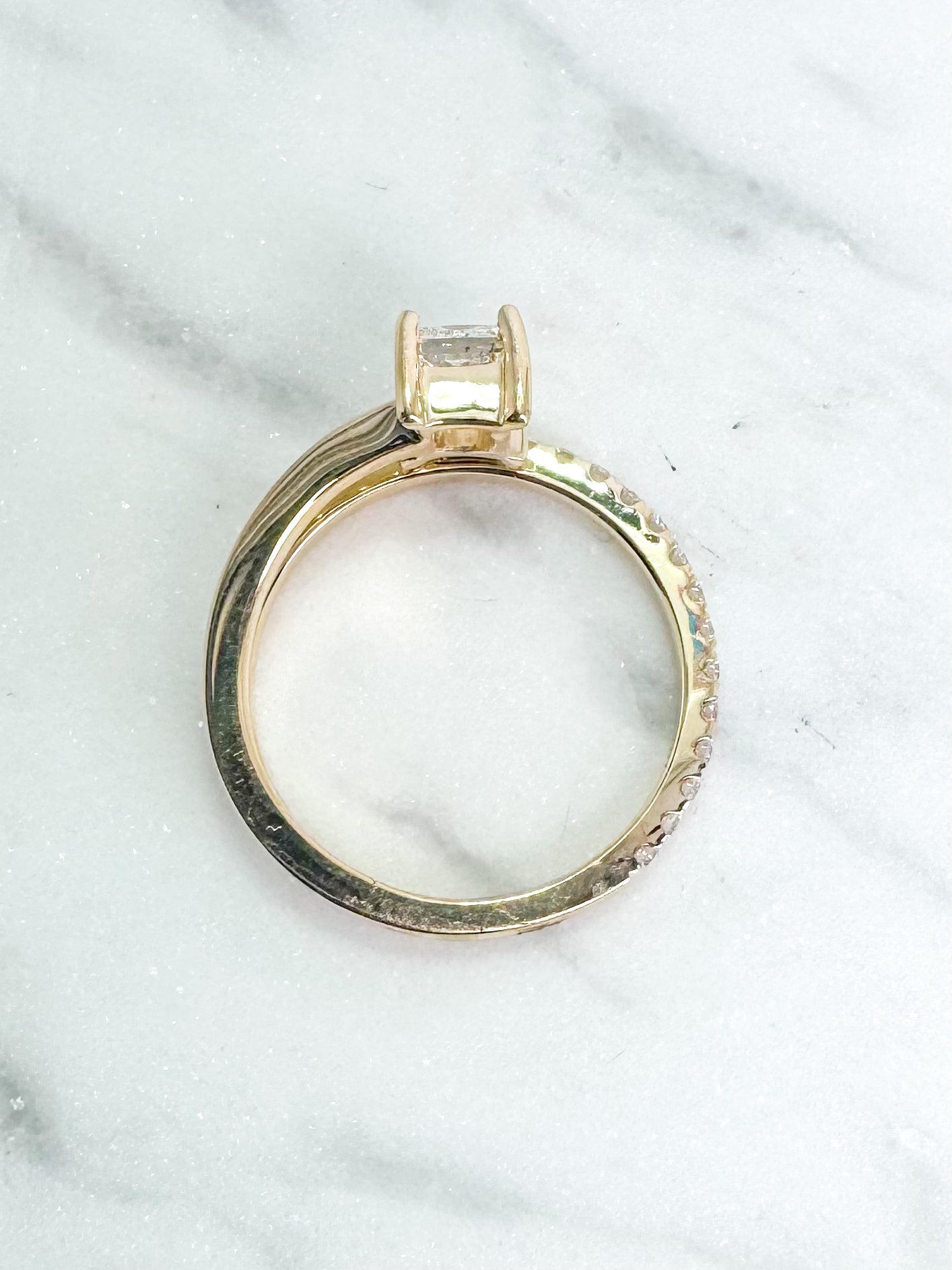 14k, yellow gold princess cut open concept diamond ring. The ring consists of a .51 carat Princess cut center stone with swooping round brilliants . Skip the wedding band because this is all in one