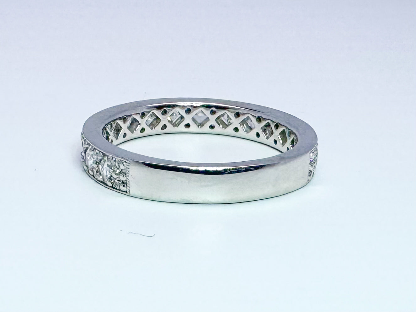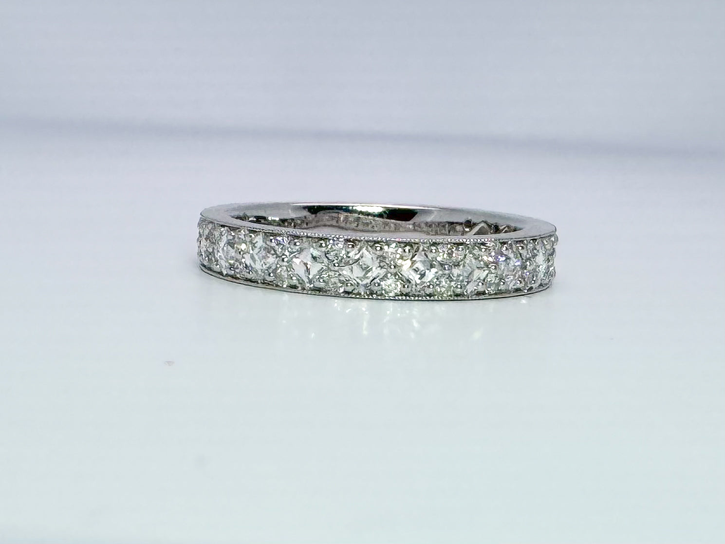 14k, white gold custom diamond band. Band consists of .30 carat total weight of round brilliant diamonds along with .85 carats of custom cut french cut diamonds set kite shaped. This is a brilliant sparkler of a ring.