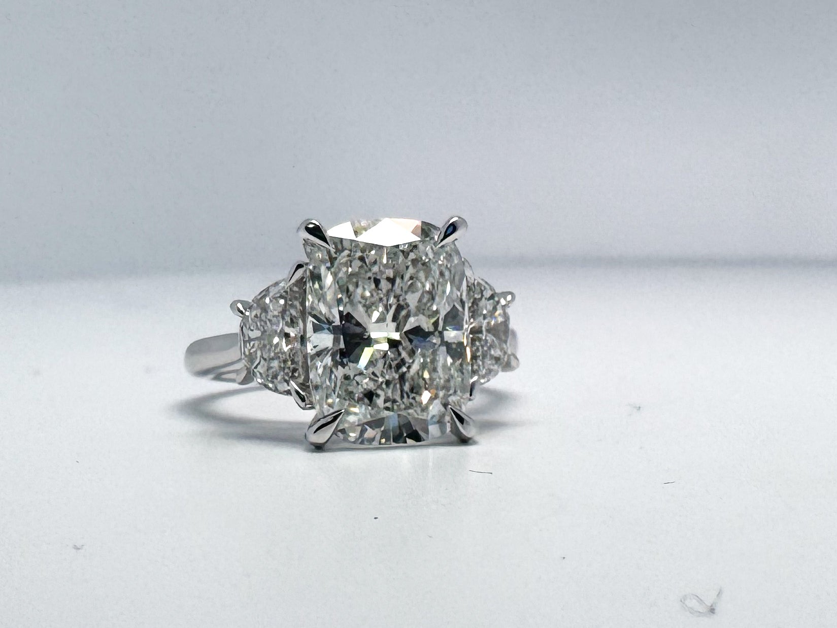 5.18 carat, Lab grown cushion cut diamond set with .82 half moon side diamonds