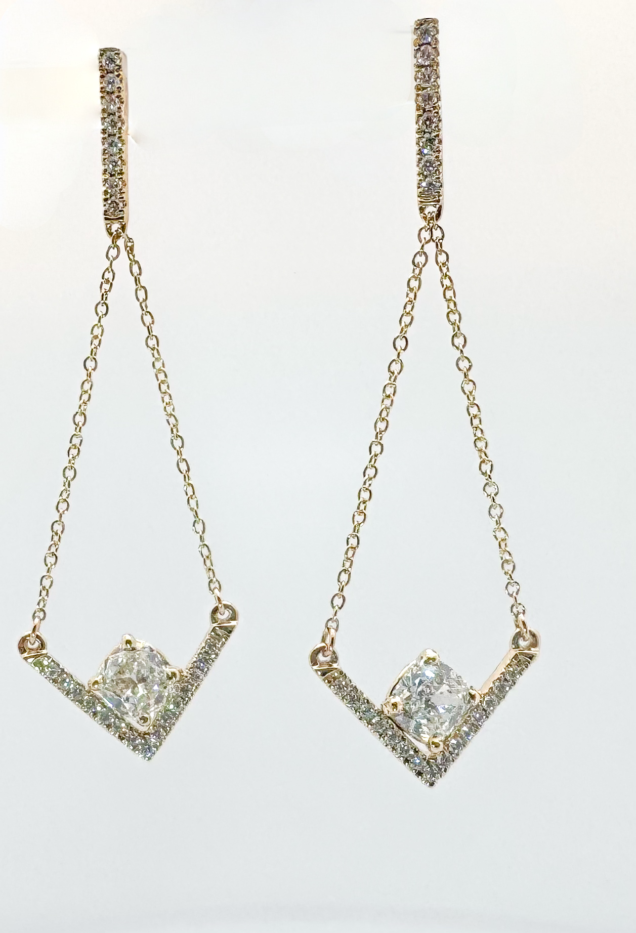 1.03ctw cushion cut center diamonds set in custom diamond dangle earrings with a chevron style dangle on a diamond bar. The earrings have .25ctw of diamonds bringing the total weight to 1.28ctw.