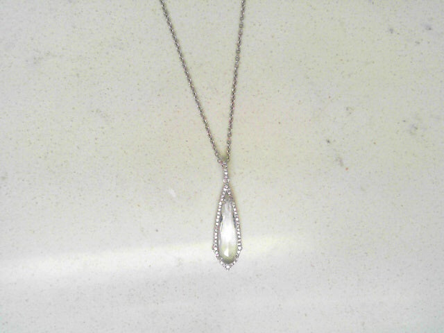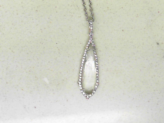 Pendant features a long pear shaped white topaz surrounded by.25ctw of diamonds in a halo.