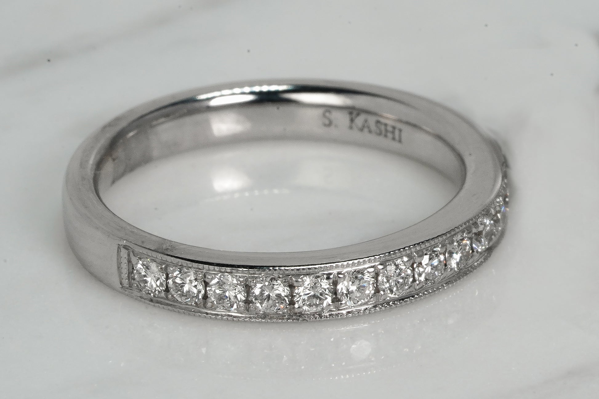 Diamond pave wedding band made by S Kashi. The band is made from 14k white gold and .35c total weight of diamonds is pave set into the top half of the band.
