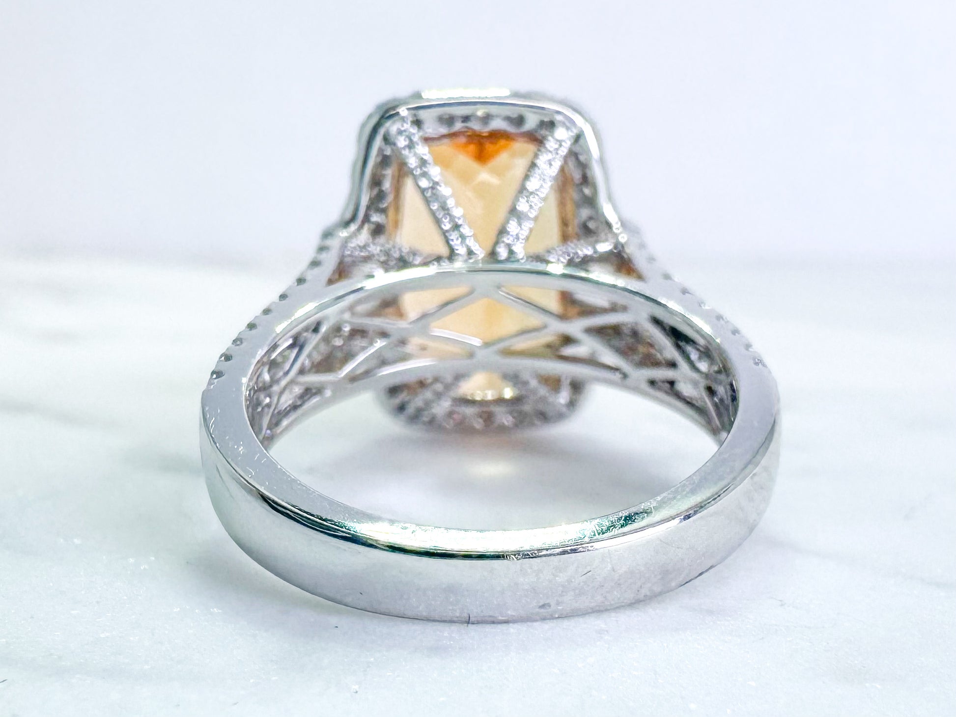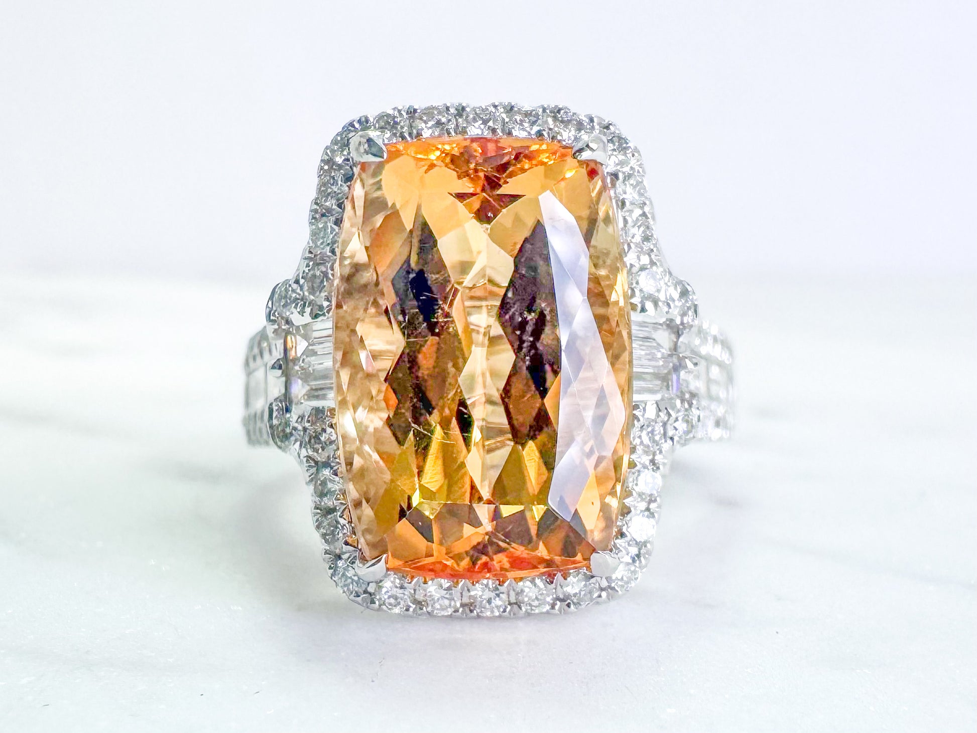 This is another Rare and valuable colored stone with many meanings. Its a symbol of Royalty that symbolizes physical strength and patience and empathy. The center is a 7.42 carat custom cut cushion Imperial topaz set in a custom diamond mounting with 1.31 carats of baguettes and round brilliant. All VS quality all F-G color.