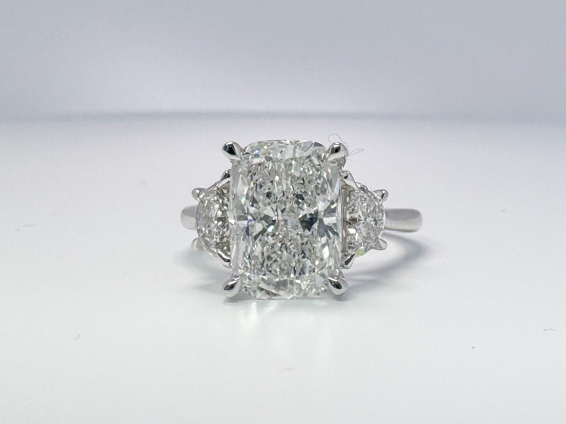 Has your partner been on Pinterest and now wants a giamega ring? We got you covered with this lab grown diamond engagement ring. This ring says" IM ENGAGED, BACK OFF". Center is a 4.15 carat cushion cut, flanked with two side diamonds that are half moons. Each stone weighing .30 each, with a total weight of .60 diamond total weight.