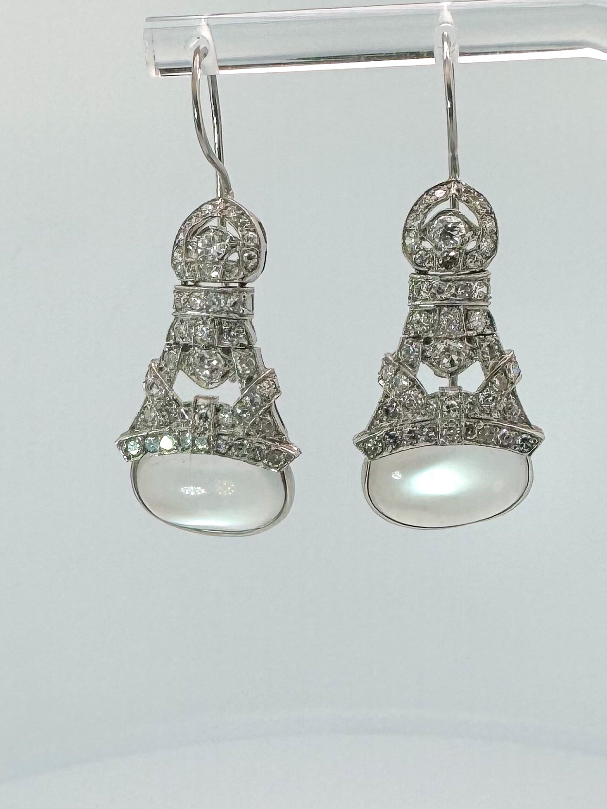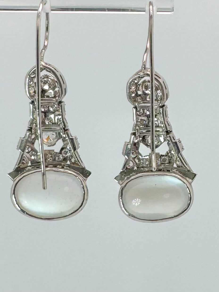 One Of a kind, Platinum, 1.79 carats of natural old european cut diamonds and Moon stones. You don't see this every day. The image is not doing the moon stone justice. This pair of earrings are a piece of history for the vintage collector in your life. Show stoppers for sure!!!