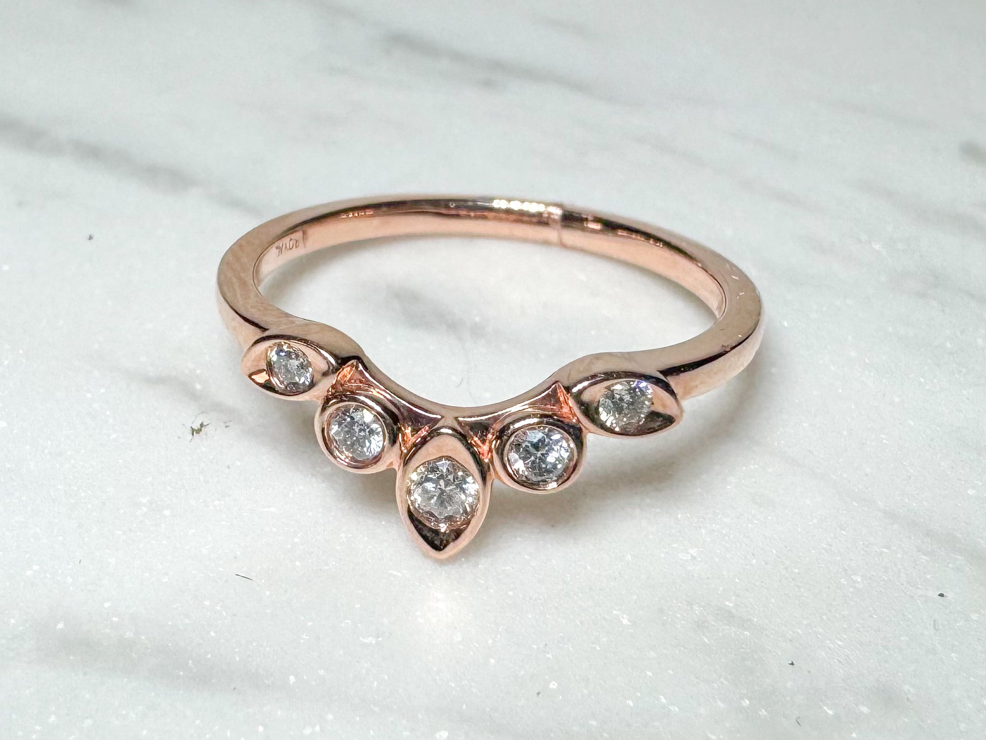 This 14kt Rose Gold band has .15ctw round diamonds set in that bezels within round & leaf shaped settings that could curve against another ring.
