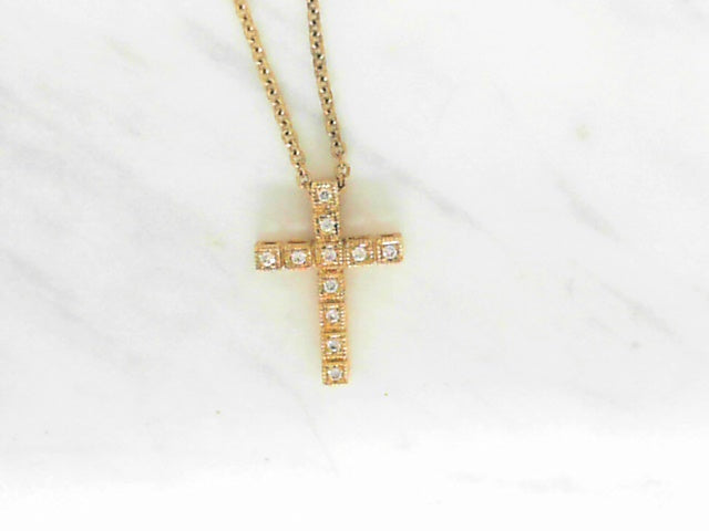 .06ctw diamond cross with millgrain detail giving a vintage vibe.The cross is dainty and measure 5/8' long and .44" wide