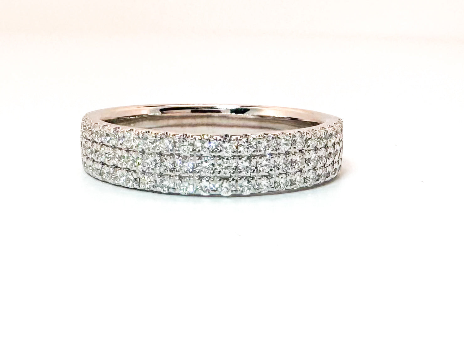 This 14kt White Gold Diamond Band has 3 rows of round diamonds .60ctw. This band makes a statement on it's own & could be worn as a right hand ring, an alternative engagement ring or even as a bold stacked look wedding band.