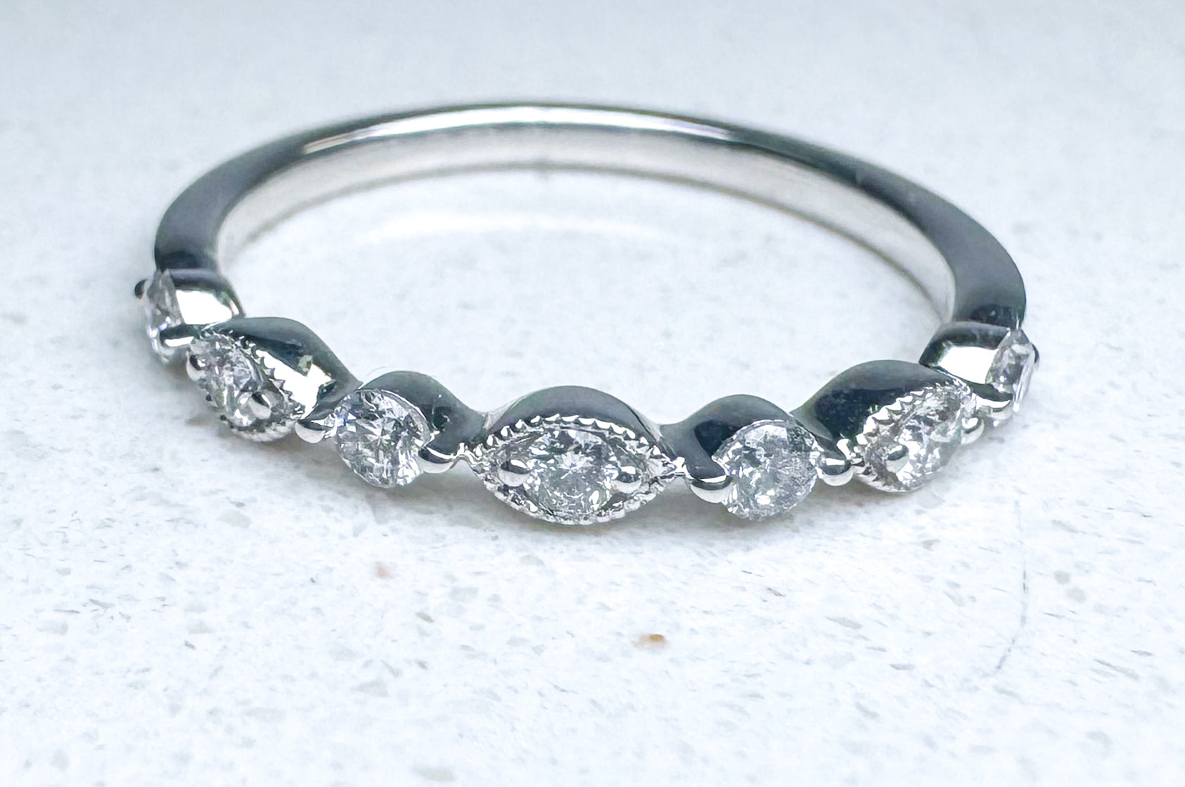 This 14kt White Gold band has .25ctw round diamonds in an alternating round/marquise shape & could be worn on it's own or stacked with other rings.